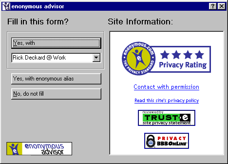 enonymity The advisor is a very small downloadable file that self-installs on a user's PC. Hundreds of thousands of users tried the program after it was released in October 1999. The program has three functions: (1) it automatically completes online forms on any webpage. Any. (2) it provides users with a privacy rating of website privacy policies for thousands of the most popular sites. (3) it offers the user the option of creating an enonymous profile, completely separate from identifiable information, which is how we offer all the long-term benefits of enonymous personalization (not to mention, our revenue stream).
